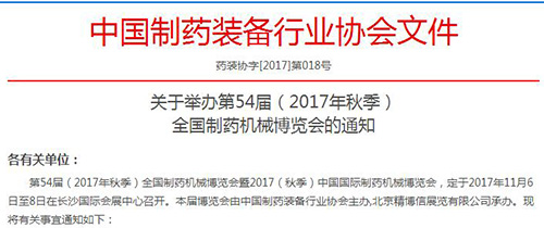 第54屆(2017年秋季)全國制藥機械博覽會暨2017(秋季)中國國際制藥機械博覽會,定于2017年11月6日至8日在長沙國際會展中心召開。本屆博覽會由中國制藥裝備行業協會主辦,北京精博信展覽有限公司承辦。