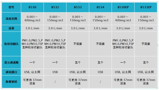 TSI 常用幾款便攜式粉塵檢測儀技術(shù)參數(shù)對(duì)比表: